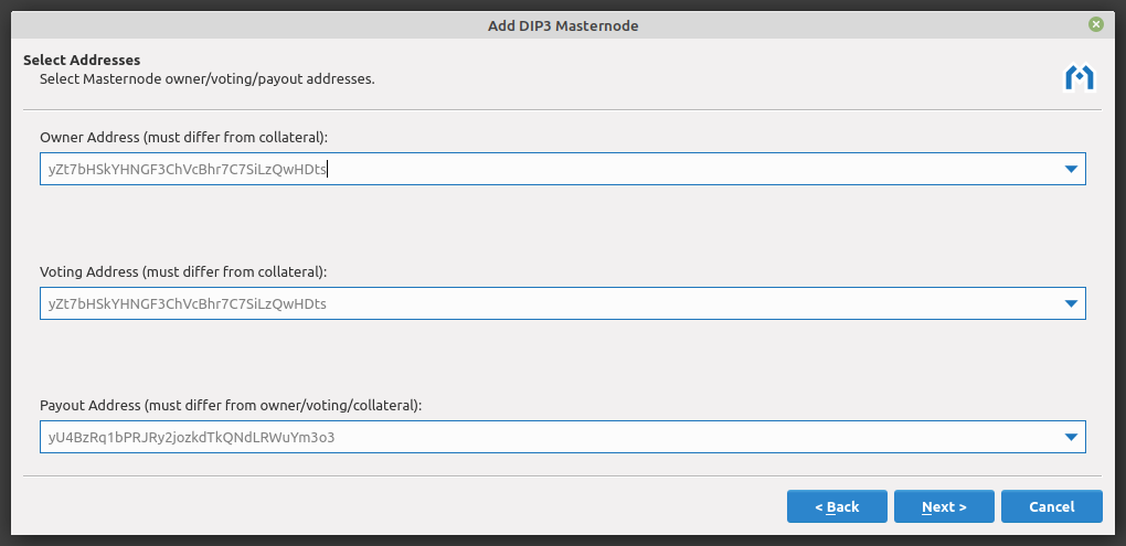Each masternode requires three addresses: owner, voting, and payout. Electrum will automatically select addresses from your wallet. Click Next to continue.