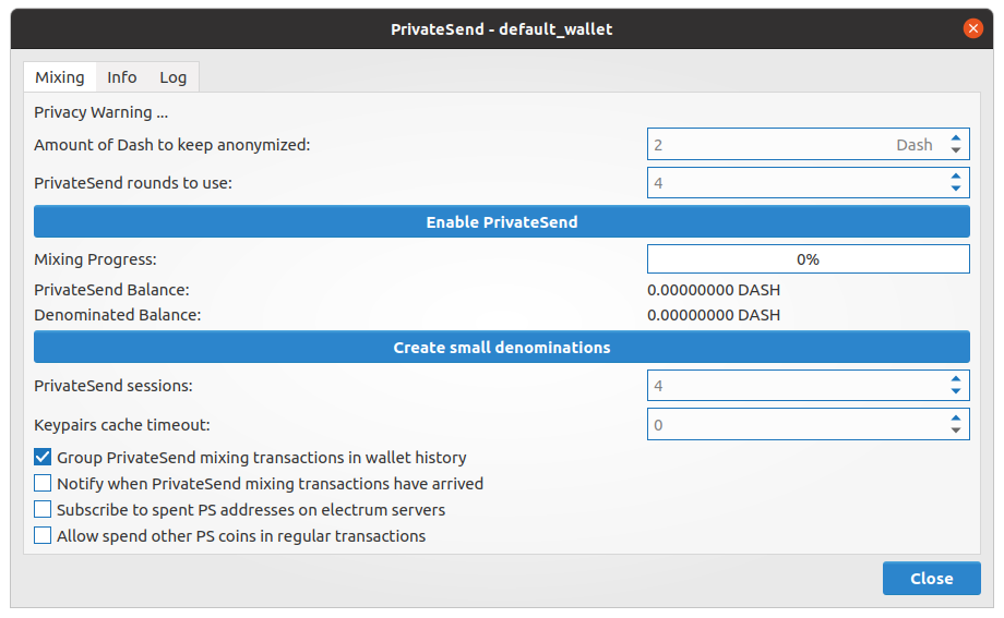PrivateSend offers users enhanced privacy when creating transactions by splitting the user’s balance into a number of predefined denominations in advance of spending. This process is known as CoinJoin. PrivateSend is available in Dash Electrum versions 3.3.8.3 and higher, with support for hardware wallets added in 3.3.8.7.