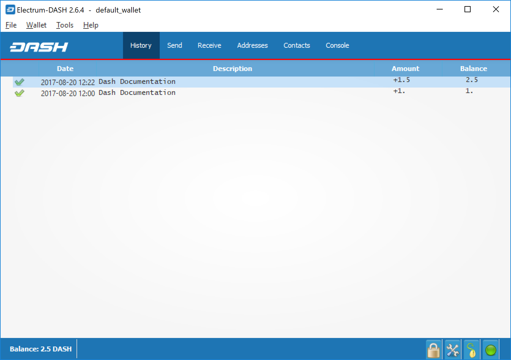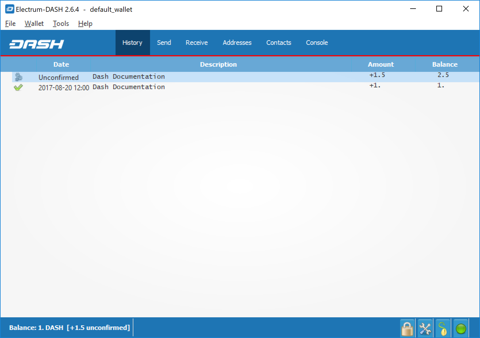 Dash Electrum wallet History tab immediately after receiving a transaction and after confirmation is complete#