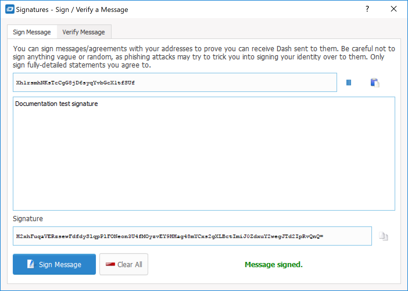 Dash wallets function by securely storing the private keys used to create transactions using publicly visible addresses on a distributed ledger called a blockchain. In some cases, it may be necessary to verify an address to demonstrate control of the funds that it holds, that you can receive using the address, or even to verify your identity to an exchange that has previously seen a transaction from that address. To avoid phishing attacks, take great care when sending signed messages to parties you do not trust, since ambiguously worded messages could be used to impersonate your identity.
