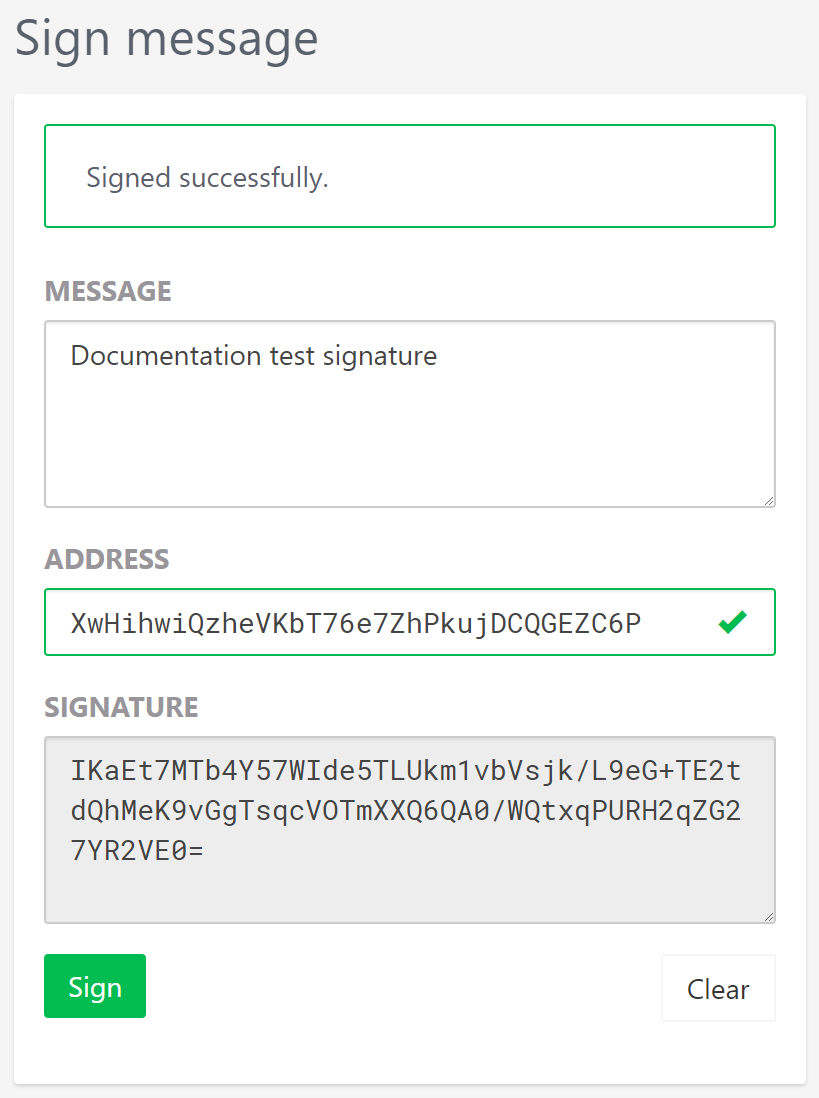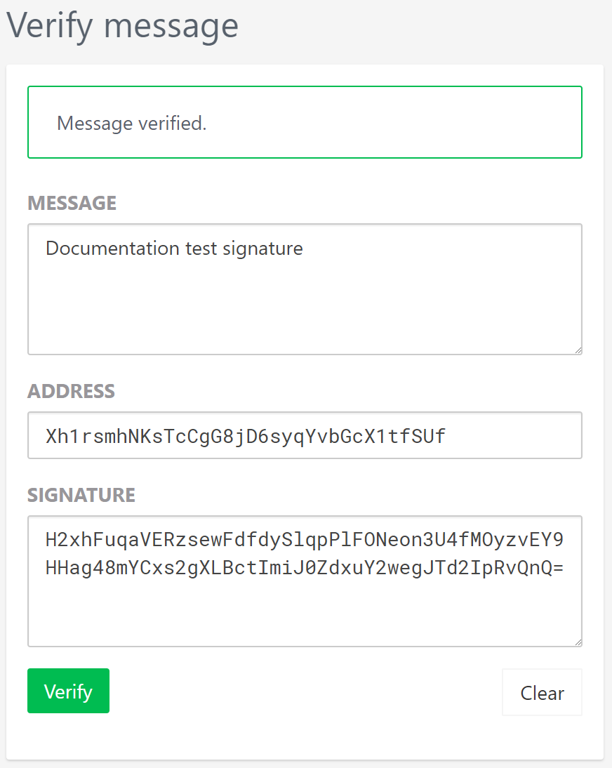 The following screenshots show how to verify a message using the Dash Core wallet (File > Sign message) and Trezor web wallet (Sign & Verify > Sign message):